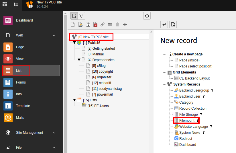 - Sollen auch Dateien hochgeladen werden, benötigt Powermail einen eigenen Dateispeicher (file storage), der zunächst auf der Wurzelseite (root page - ID 0) erstellt werden muss.