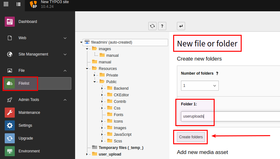 - Zunächst ein neues Verzeichnis unter "fileadmin" erstellen (Abb. 1)